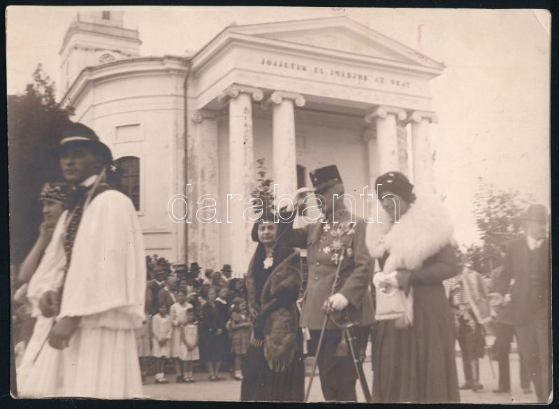 cca 1930-1940 Habsburg-Lotaringiai József Ágost főherceg és felesége, Auguszta Mária Lujza bajor hercegnő egy ünnepi körmeneten, fotónyomat, hátoldalán ragasztás nyomaival, 18x13,5 cm