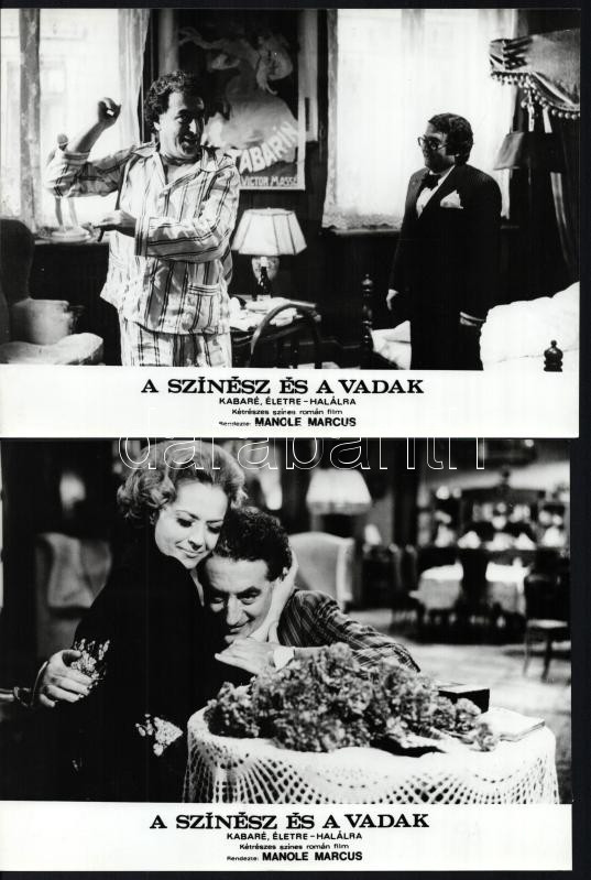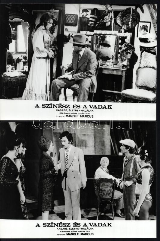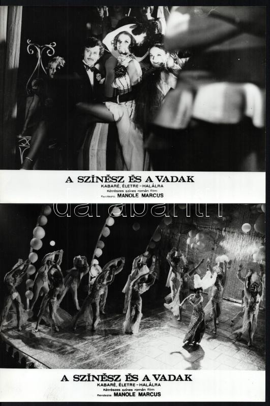 cca 1975 ,,A színész és a vadak - kabaré, életre - halálra" című román film jelenetei és szereplői, 9 db vintage produkciós filmfotó ezüst zselatinos fotópapíron, a használatból eredő (esetleges) kisebb hibákkal, 18x24 cm