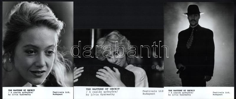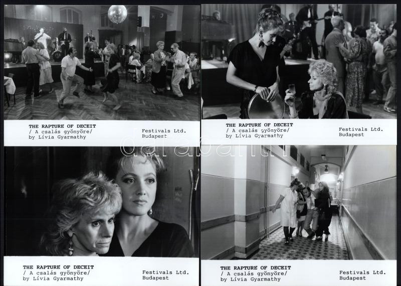 cca 1992 ,,A csalás gyönyöre" című magyar film jelenetei és szereplői (rendezte Gyarmathy Lívia), 7 db vintage produkciós filmfotó ezüst zselatinos fotópapíron, a használatból eredő (esetleges) kisebb hibákkal, a promóciós képeken levő, idegen nyelvű felirat arra utal, hogy a HUNGAROFILM a filmet kiajánlotta külföldi filmforgalmazók számára, 13x18 cm