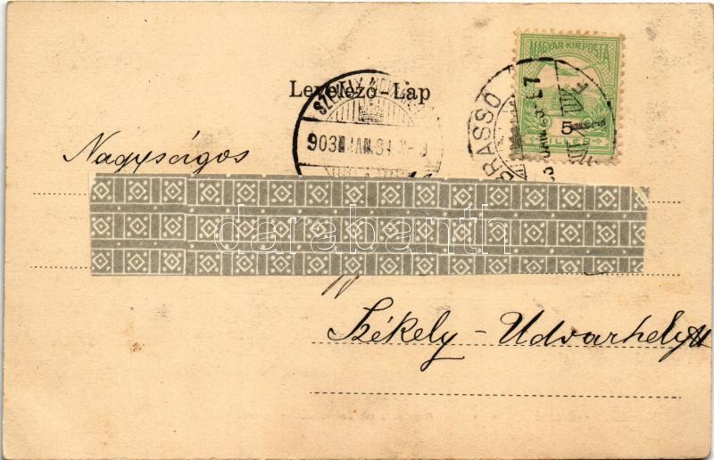 1903 Brassó, Kronstadt, Brasov; Fő tér, piac, hintók, Fekete templom, Albina, Heinrich Wagner, J. L. & A. Hesshaimer üzlete. Zeidner H. kiadása / main square, market, church, shops, bank (fl)