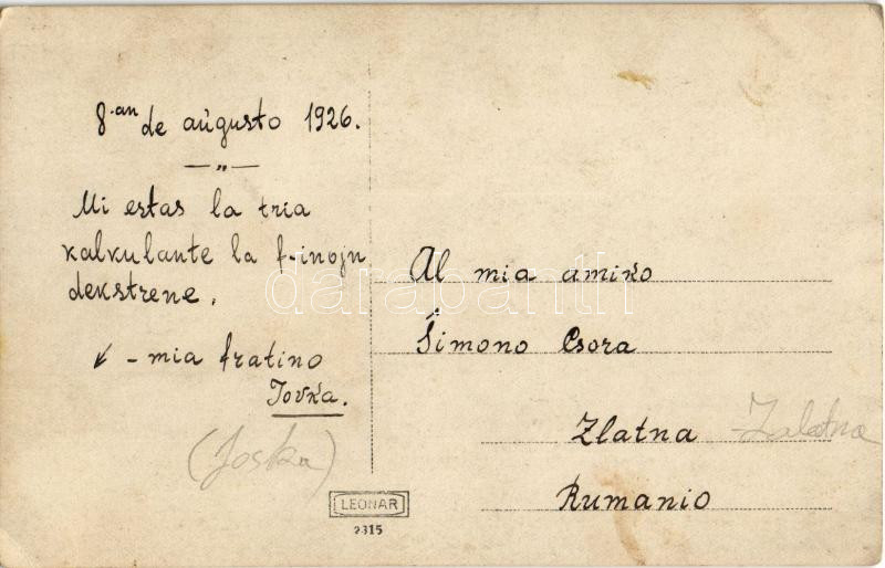 Leírás: 1926 Zalatna, Zlatna; családi fotó eszperantó üdvözlettel és címzéssel / family photo, Esperanto letter on the backside. photo (EK)