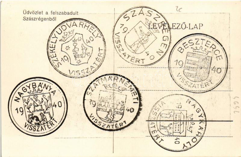 Leírás: 1940 Szászrégen, Reghin; Fő tér, autóbusz, Nivea, Cauron üzlet. Üdvözlet a felszabadult Szászrégenből! / Hauptplatz / main square, autobus, shops + "1940 Szászrégen visszatért" "1940 Székelyudvarhely visszatért" "1940 Beszterce visszatért" "1940 Szatmárnémeti visszatért" "1940 Nagybánya visszatért" "1940 Nagykároly visszatért" So. Stpl. (fl)