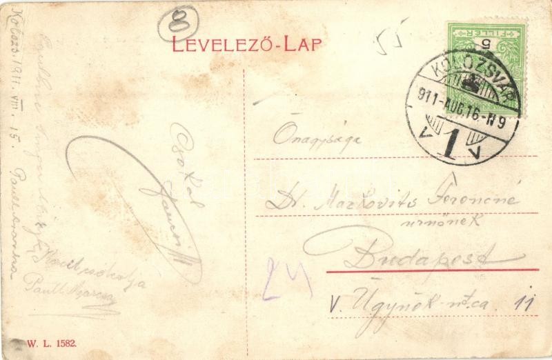 Leírás: Kolozs, Cojocna; M. kir. áll. elemi népiskola, magyar címer. W. L. 1582. / school, Hungarian coat of arms (EB)
