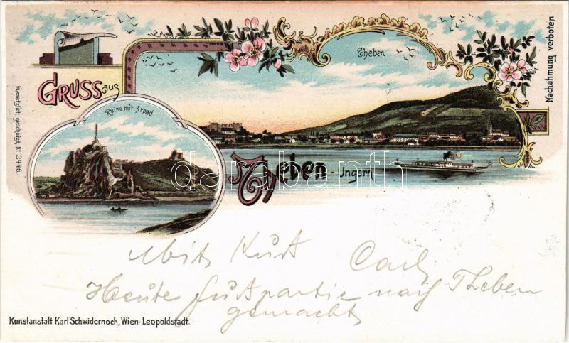 Leírás: 1899 (Vorläufer) Dévény, Theben a. d. Donau, Devín (Pozsony, Bratislava); Ruine mit Arpad / vár, Árpád emlékmű / Devínsky hrad / castle, Millennium monument. Kunstanstalt Karl Schwidernoch No. 2446. Art Nouveau, floral, litho (vágott / cut)