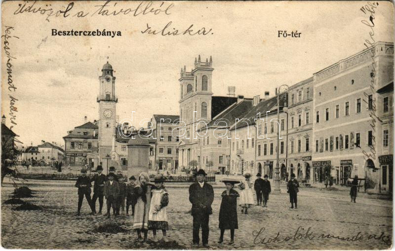 1906 Besztercebánya, Banská Bystrica; Fő tér, Özv. Rosenfeld Mórné, Fischer Alajos, Roth és Kovács, Ehrenwald Gyula, Grünwald és Schäffer J. József üzlete / main square, shops (EK)