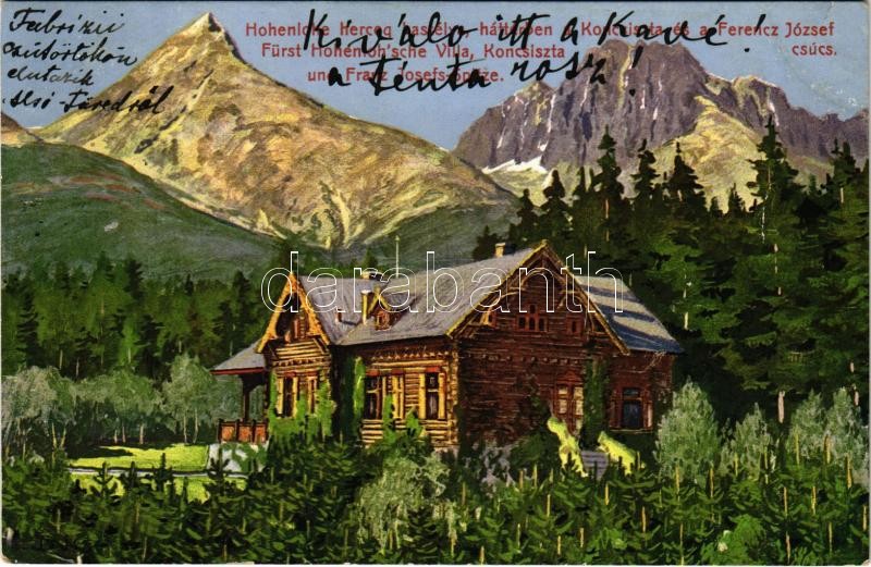 1912 Felsőhági, Visne Hagy, Vysné Hágy (Tátra, Magas-Tátra, Vysoké Tatry); Hohenlohe herceg vadászkastélya, háttérben a Koncsiszta és a Ferenc József csúcs. Cattarino S. utóda Földes Samu kiadása / Fürst Hohenlohe'sches Villa (Jagdschloss), Koncsiszta und Franz Josefs-Spitze / hunting lodge, hunting castle, mountain peaks Koncistá and Stít Frantiska Jozefa (Gerlachovsky stít) (kis szakadás / small tear)