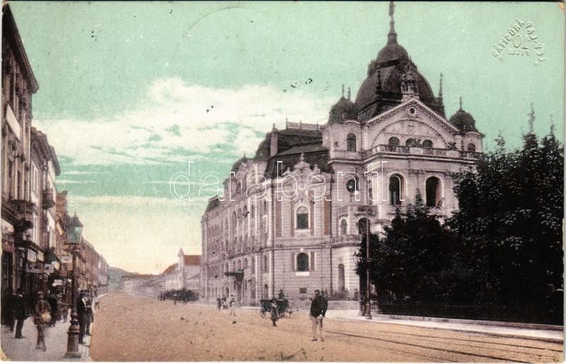 Leírás: 1914 Kassa, Kosice; Nemzeti színház, üzletek / street view, theatre, shops (EK)