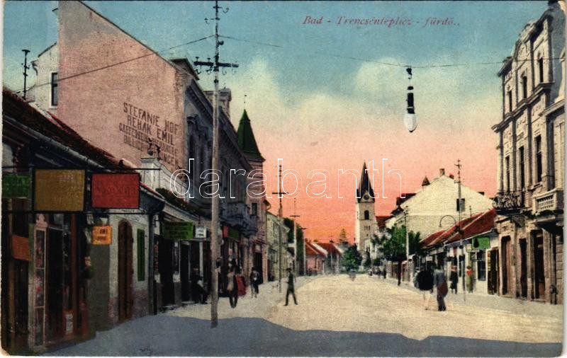 Leírás: Trencsénteplic, Trencianske Teplice; utca, Rehák Emil üzlete / street view, shops