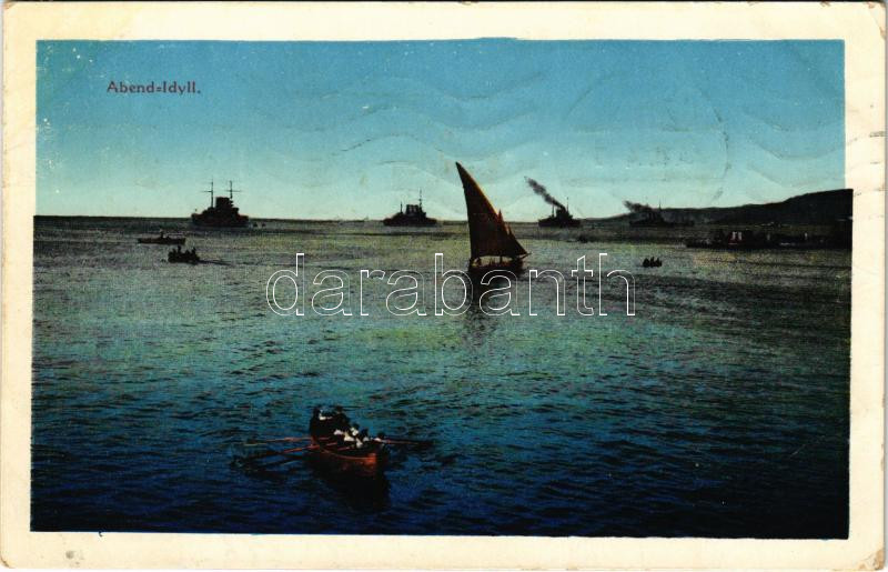 Leírás: 1914 Abend-Idyll. K.u.K. Kriegsmarine / WWI Austro-Hungarian Navy battleships, mariners in boat. G.C. Pola 1912/13. (EB)