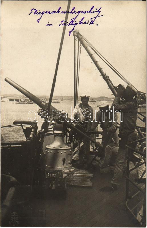 Osztrák-magyar haditengerészet lőgyakorlata 66 mm-es légvédelmi fegyverrel, matrózok / K.u.K. Kriegsmarine Fliegerabwehrgeschütz / WWI Austro-Hungarian Navy mariners during practice shooting of a three-inch anti-aircraft gun. Stephan Vlach Pola photo