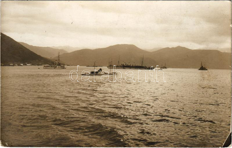 SMS Gäa/Gaea (ex SS Fürst Bismarck) torpedó anyahajó, német tengeralattjárók, két Monarch-osztályú csatahajó és egy Zenta-osztályú cirkáló / K.u.K. Kriegsmarine / Austro-Hungarian Navy depot ship, German submarines, 2 Monarch-class battleships and a Zenta-class small cruiser. photo