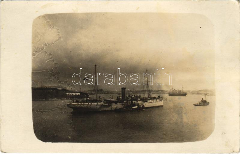 Leírás: SMS PELIKAN az Osztrák-Magyar Haditengerészet parancsnoki yachtja és torpedó-raktárhajója / SM Schiff "Pelikan" Torpedodepotschiff und Admiralsyacht. K.u.K. Kriegsmarine / Austro-Hungarian Navy, SMS Pelikan admiral's yacht and torpedo depot ship. photo (fl)