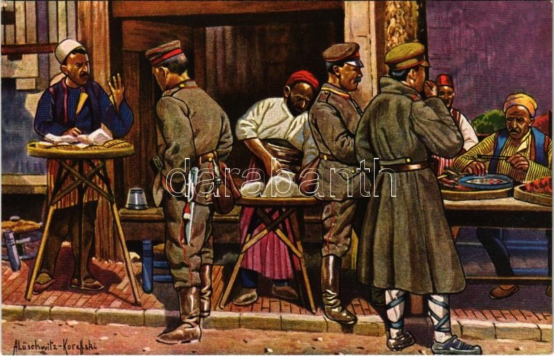 Leírás: Straßerleben in Üsküb / WWI German military art postcard, street scene in Skopje s: A. Lüschwitz-Koreffski