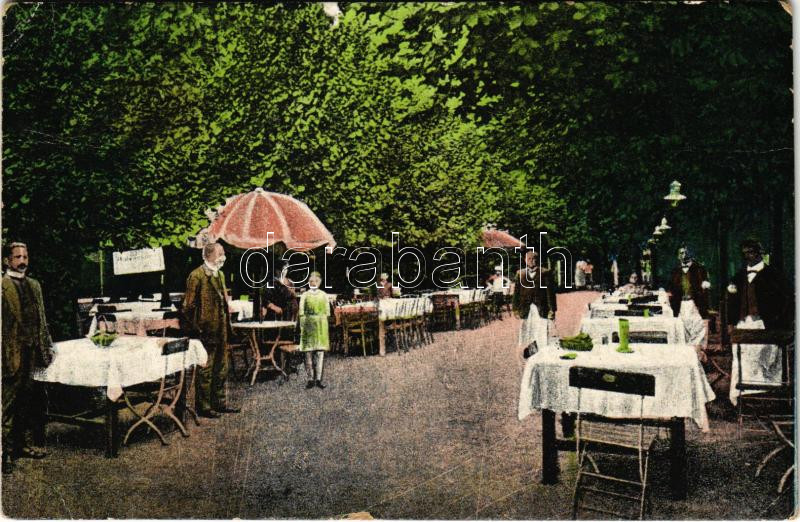 Leírás: 1920 Gyopárosfürdő (Orosháza), Községi szálloda kert részlete pincérekkel, étterem (Rb)