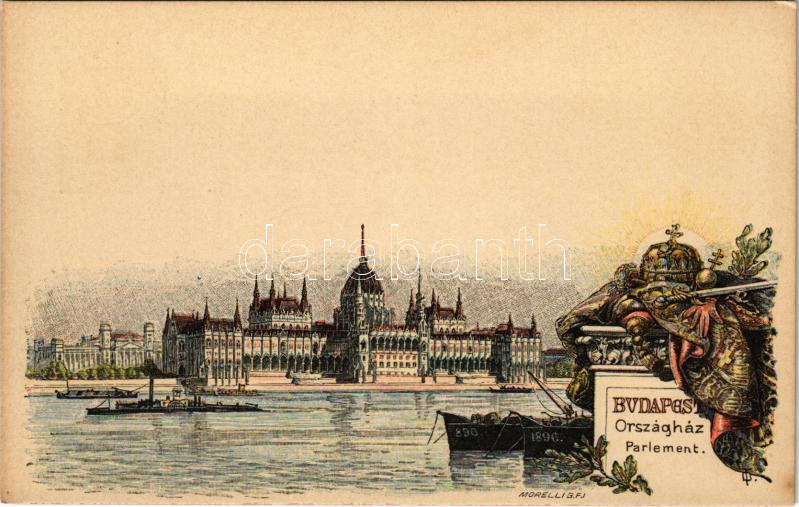 Leírás: Budapest V. Ezredéves Országos Kiállítás, Országház, Parlament. barna 2 Kr. Ga. s: Dörre T., Morelli