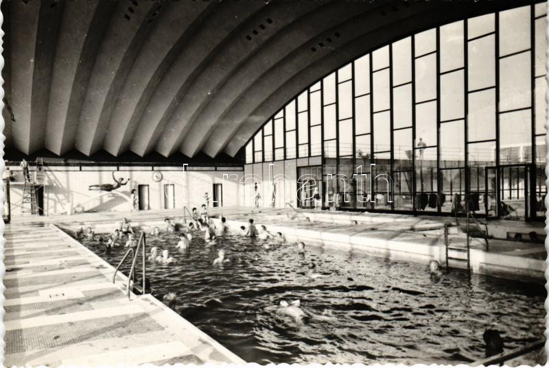 Leírás: Hajdúszoboszló, Béke üdülő fedett gyógyfürdője, fürdőzők. Képzőművészeti Alap