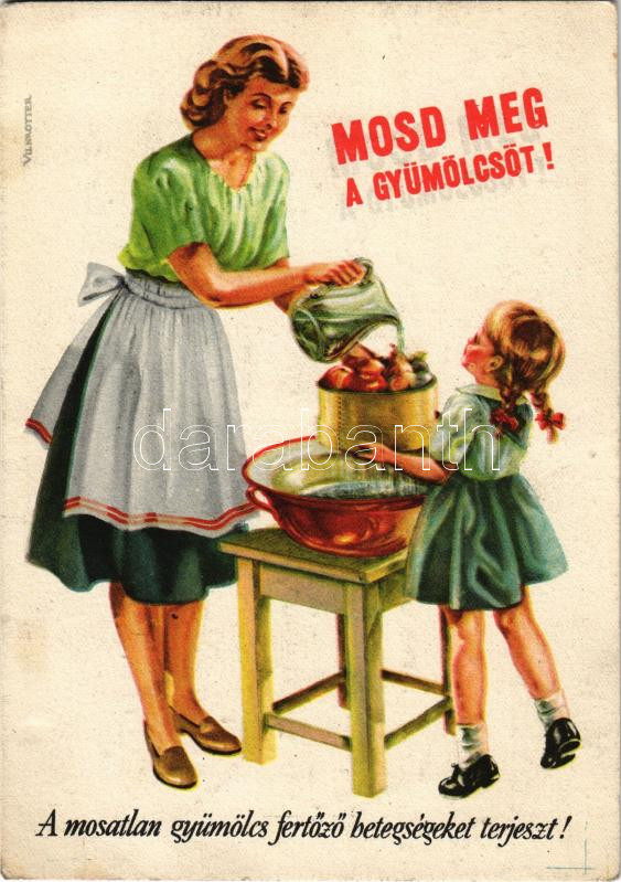 Mosd meg a gyümölcsöt! A mosatlan gyümölcs fertőző betegségeket terjeszt! Kiadja az Egészségügyi Minisztérium / Hungarian health propaganda s: Vilnrotter (EK)