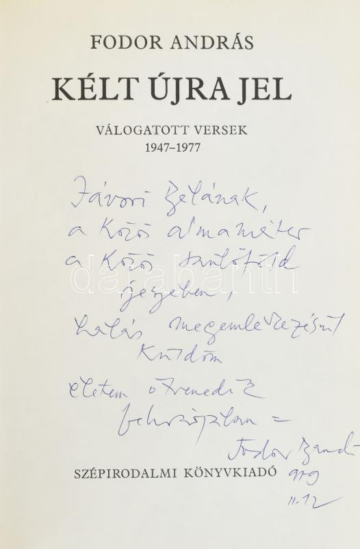 Fodor András: Kélt újra jel. Válogatott versek 1947-1977. Bp., 1979, Szépirodalmi Könyvkiadó. Első kiadás. Kiadói egészvászon-kötés, kiadói papír védőborítóban. A szerző, Fodor András (1929-1997) Kossuth-díjas költő, esszéíró által Jávori Béla (1931-2008) újságíró, főszerkesztő, fotóművész részére DEDIKÁLT példány.