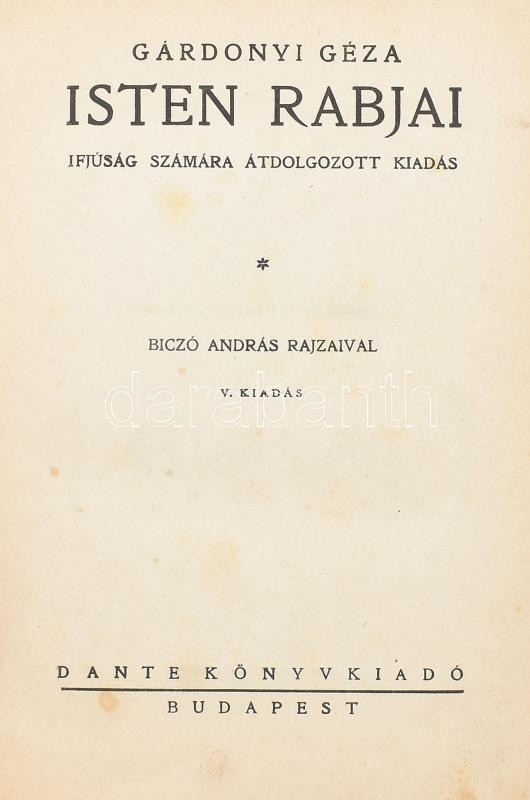 Gárdonyi Géza: Isten rabjai. Ifjúság számára átdolgozott kiadás. Bp.,1943.,Dante. Ötödik kiadás. Biczó András rajzaival. Átkötött félvászon-kötés, kopott borítóval, kissé sérült gerinccel, laza fűzéssel.
