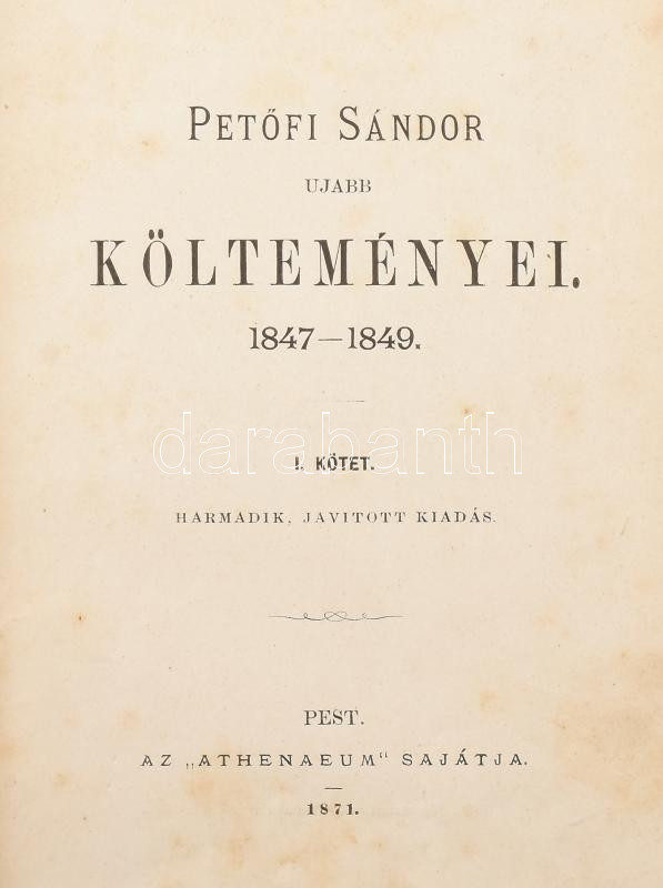 Petőfi Sándor újabb költeményei I-II. Pest, 1871, Athenaeum. Kiadói ar... https://www.darabanth.com/hu/451-Gyorsarveres/451.0/Konyvek/Konyvek-Egyeb-ritkasagok~1000029/Petofi-Sandor-ujabb-koltemenyei-I-II-Pest-1871-Athenaeum-Kiadoi-aranyozott-egeszvaszon-k~II3004167