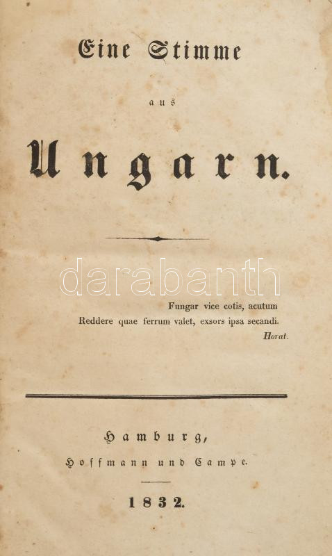 [SZENICZEI PÁL]: Eine Stimme aus Ungarn. Egy hang Magyarországról. Hamburg, 1832. A szerző Rousseau és a liberalizmus eszméiért rajongott, könyvében megjósolta az 1849-es orosz inváziót. Félbőr kötés, viseltes állapotban.