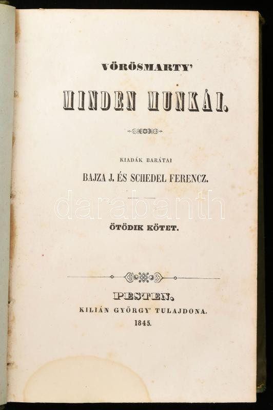 Vörösmarty [Mihály] minden munkái. Kiadák barátai Bajza J[ózsef] és Schedel Ferencz. V-VI. köt. [Egy kötetben]. Pest, 1845, Kilián György, 384+(2) p., 252+(2) p. Festett gerincű egészvászon-kötésben, kissé foltos, kopottas borítóval, helyenként foltos lapokkal.