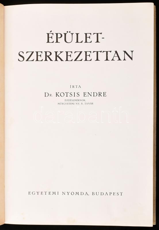 Dr. Kotsis Endre: Épületszerkezettan. Bp., [1945], Egyetemi Nyomda, VIII+376 p. Gazdag fekete-fehér képanyaggal illusztrálva. Kiadói félvászon-kötés, a hátsó kötéstábla és a lapok sarkán ázásnyomokkal.