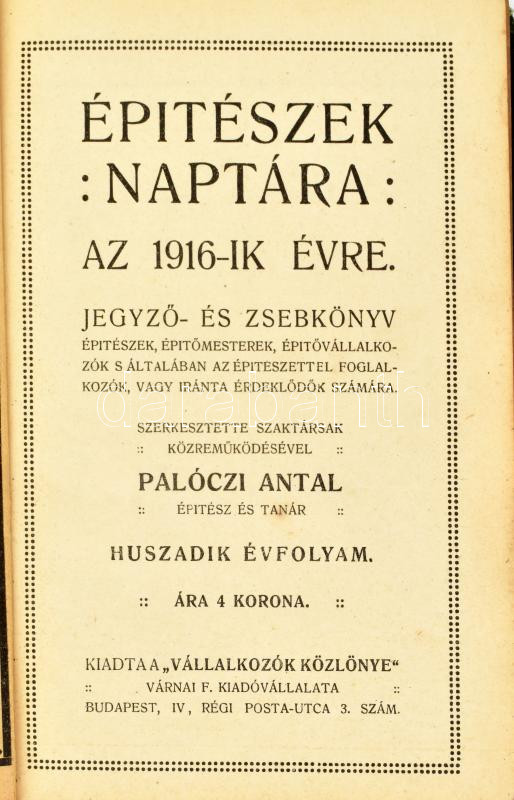 Építészek naptára az 1916-ik évre. Jegyző- és zsebkönyv. szerk. Pálócz... https://www.darabanth.com/hu/451-Gyorsarveres/451.0/Konyvek/Konyvek-Epiteszet-muveszet~1000013/Epiteszek-naptara-az-1916-ik-evre-Jegyzo-es-zsebkonyv-szerk-Paloczi-Antal-XX-evf-K~II2998426