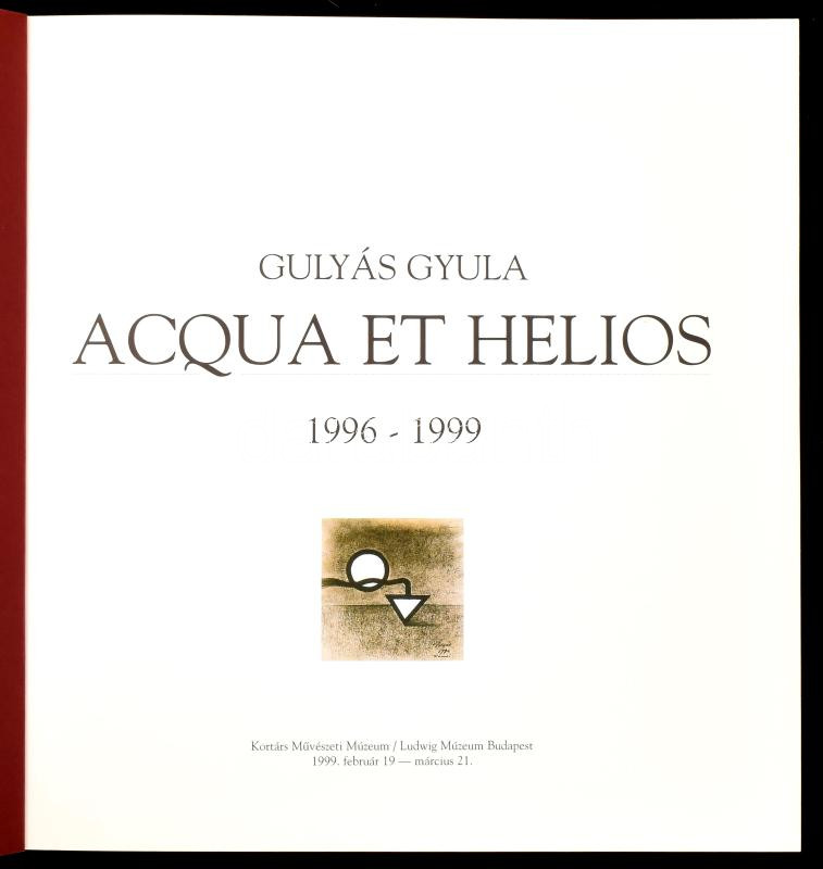 Gulyás Gyula: Acqua et Helios. 1996-1999. Kiállítási katalógus. A művész, Gulyás Gyula (1944-2008) Kossuth-díjas szobrászművész által Haraszty István "Édeskének" (1934-2022), Kossuth-díjas szobrász, festőművész és felesége részére DEDIKÁLT példány. Bp., 1999., Kortárs Művészeti Múzeum - Ludwig Múzeum. A művész munkáinak reprodukcióival illusztrált. Kiadói papírkötés.
