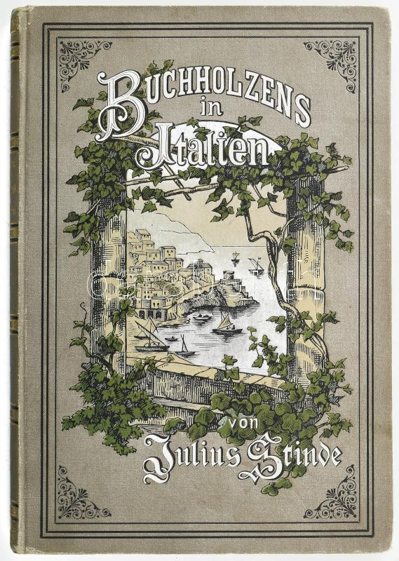 Stinde, Julius: Buchholzens in Italien. Reise-Abenteuer von Wilhelmine Buchholz. Berlin, 1888, Freund & Jeckel, XV+(1)+168+(8) p. Német nyelven. Kiadói illusztrált, aranyozott gerincű, festett egészvászon-kötés, az előzéklapon és a szennylapokon vágásból eredő hiánnyal, két lapon a vágásból eredő sérüléssel.