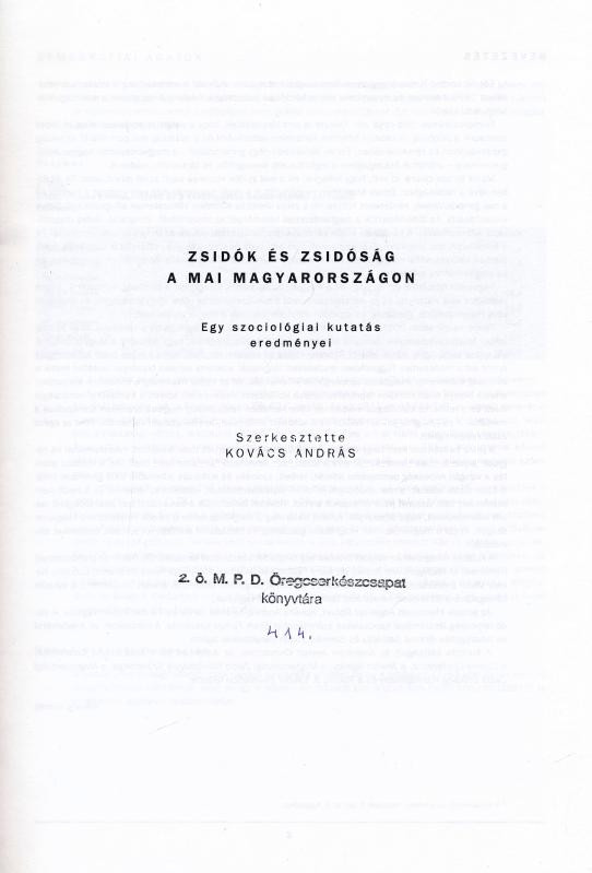 Zsidók és zsidóság a mai Magyarországon. Egy szociológiai kutatás eredményei. Szerk.: Kovács András. Bp., 2002, Szombat, 23 p. Kiadói tűzött papírkötés.
