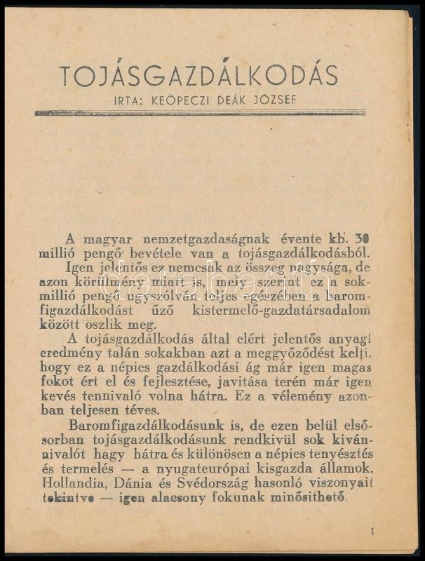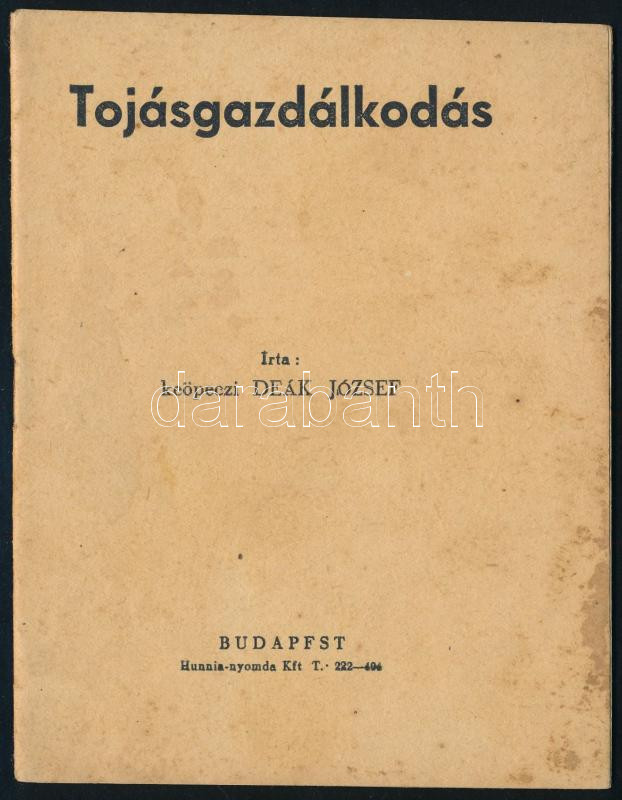 Leírás: keöpeczi Deák József: Tojásgazdálkodás. Bp., é.n., szerzői kiadás (Hunnia-ny.), 30+(2) p. Kiadói tűzött papírkötés, kissé foltos borítóval.