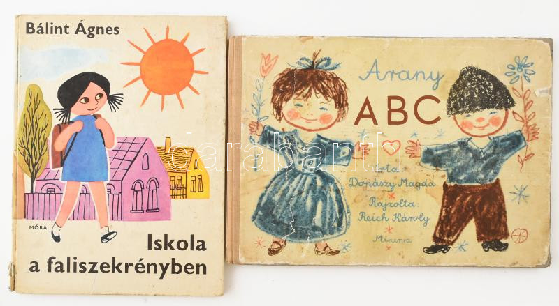 Leírás: 2 db mesekönyv - Donászy Magda: Arany ABC. Rajzolta: Reich Károly. H.n., Minerva. + Bálint Ágnes: Iskola a faliszekrényben. Bp., 1975, Móra. Félvászon és kartonált kötésben, firkákkal, megvisel állapotban.