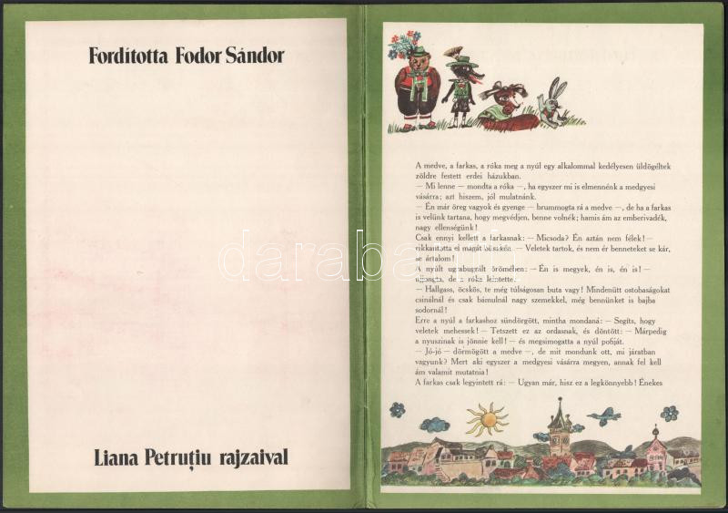 Josef Haltrich: A medve, a farkas, a róka és a nyúl a medgyesi vásáron. Ford.: Fodor Sándor. Liana Petrutiu rajzaival. Bukarest, 1983, Kriterion. Kiadói tűzött papírkötés.