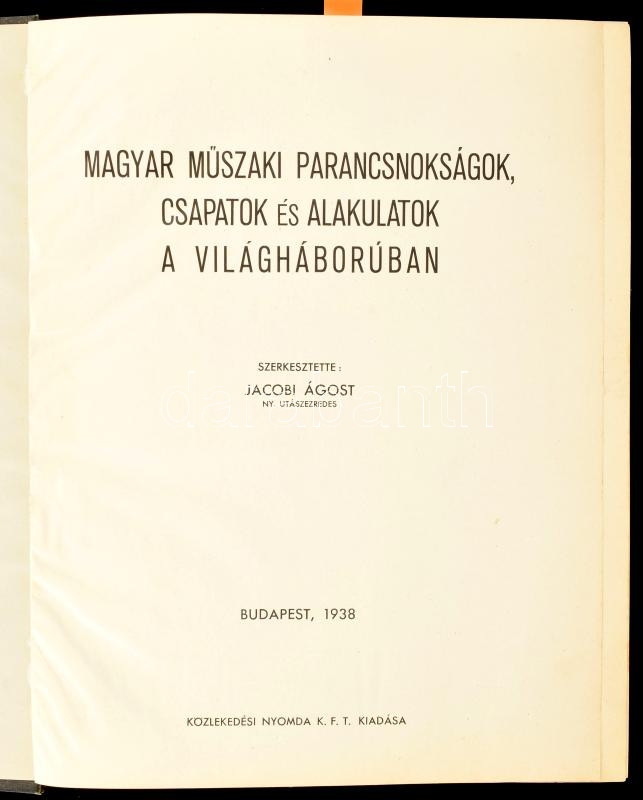 Magyar műszaki parancsnokságok, csapatok és alakulatok a világháborúban. Szerk.: Jacobi Ágost. Bp., 1938, Közlekedési Nyomda Kft., (8)+814 p. Gazdag fekete-fehér képanyaggal illusztrálva. Kiadói egészvászon-kötés, jó állapotban, a borítón némi kopással, helyenként minimálisan foltos lapokkal.