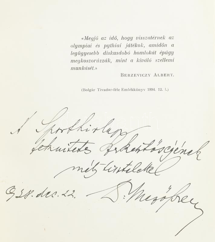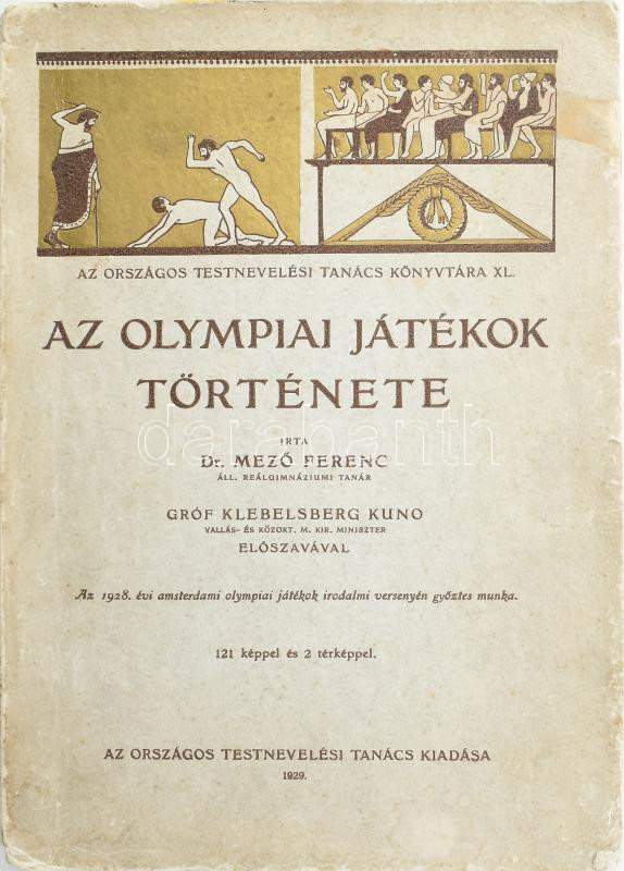 Dr. Mező Ferenc Az olympiai játékok története. Gróf Klebelsberg Kuno vallás és közoktatási m. kir. miniszter előszavával. Országos Testnevelési Tanács Könyvtára XL. Bp., 1929., Országos Testnevelési Tanács, 301 p. + 2 térkép (kihajtható.) Első kiadás. Gazdag szövegközti képanyaggal illusztrált. Kiadói, kopott papírkötésben, DEDIKÁLT példány. Első néhány lapon kis foltok