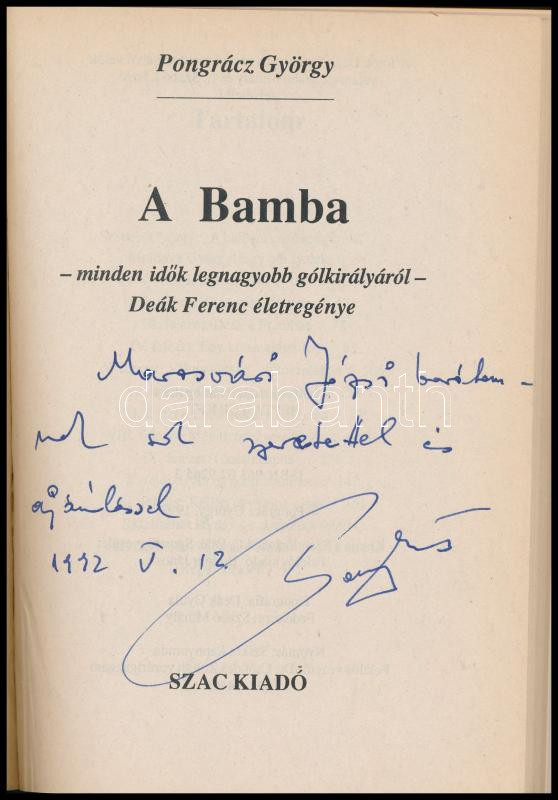 Pongrácz György: A Bamba. Deák Ferenc életregénye. Bp., 1992, SZAC. Fekete-fehér fotókkal illusztrált. Kiadói papírkötés. A szerző, Pongrácz György (1939-2001) sportoló, újságíró által DEDIKÁLT példány.