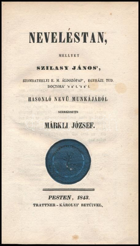 Szilasy János: Neveléstan, ... Hasonló nevü munkából szerkeszte Márkli... https://www.darabanth.com/hu/451-Gyorsarveres/451.0/Konyvek/Konyvek-Tarsadalomtudomany~1000020/Szilasy-Janos-Nevelestan-Hasonlo-nevu-munkabol-szerkeszte-Markli-Jozsef-Pest-1843-T~II2963322