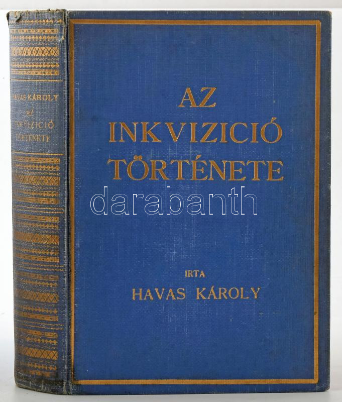 Havas Károly: Az inkvizició története. Több kútforrás nyomán írta: - - . 22 műmelléklettel. Bp., 1927, Rozsnyai Károly, 504 p. + 22 (fekete-fehér képek) t. Kiadói aranyozott egészvászon-kötés, kissé kopott borítóval, sérült gerinccel, helyenként foltos lapokkal.