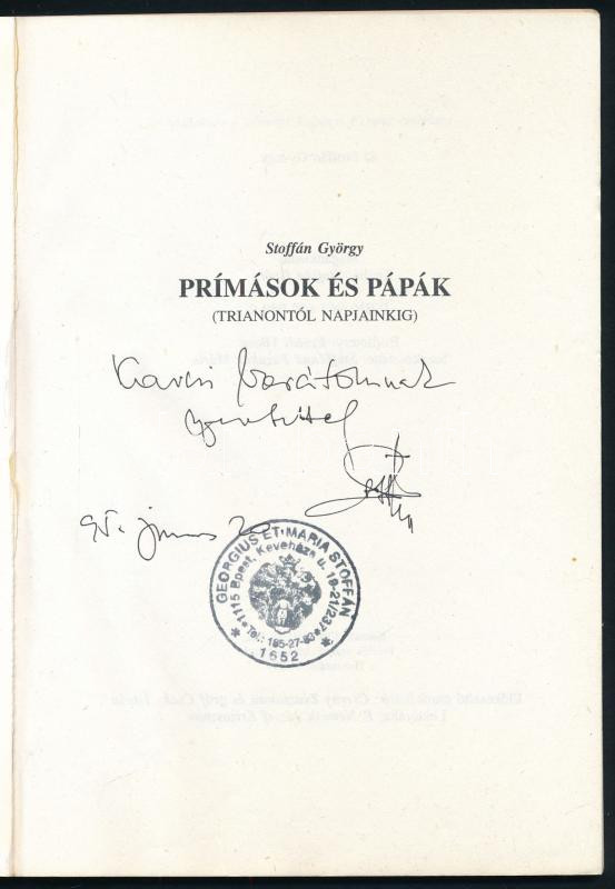 Leírás: Stoffán György: Prímások és pápák. (Trianontól napjainkig). H.n., é.n., szerzői magánkiadás. Kiadói papírkötés. A szerző által DEDIKÁLT példány.