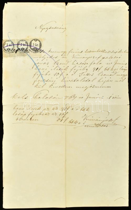 Leírás: 1861-1867 Vegyes okmány tétel, benne egy keresztlevél 30 kr. és 6 kr okmánybélyeggel és egy nyugta 2 db 7 kr. és 1 db 5 kr. okmánybélyeggel.