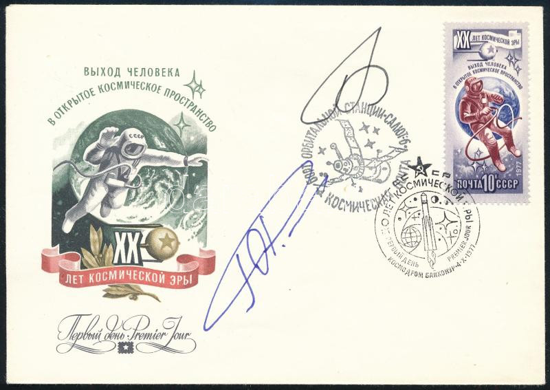 Leírás: Jurij Romanyenko (1944- ), Georgij Grecsko (1931- ) szovjet űrhajósok aláírásai emlékborítékon / Yuriy Romanenko (1944- ), Georgiy Grechko (1931- ) Soviet astronauts on memorial envelope