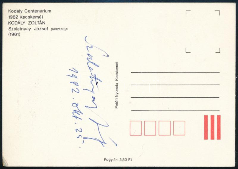 Leírás: Szalatnyay József, Klauszer (1915-1994) festő, grafikus autográg aláírása Kodály centenárium képeslapon saját festményéről Kodály Zoltánról