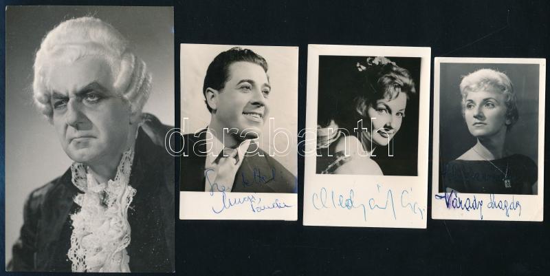 Leírás: Színészek, énekesek aláír fotói: Várady Magda, Mucsi Sándor, Mednyánszky Ági, Hámory Imre, 4 db