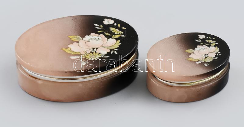 Leírás: 2 db ovális, ásványból készült, virágmintás dobozka, 12x8,5x4 cm és 8x6x3,5 cm
