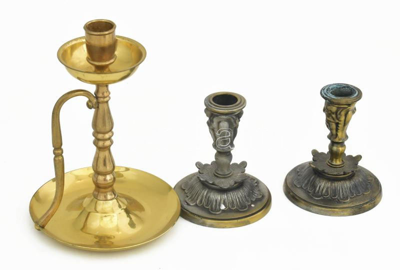 Leírás: 3 db gyertyatartó, réz, egyéb fém 10 cm, 20 cm