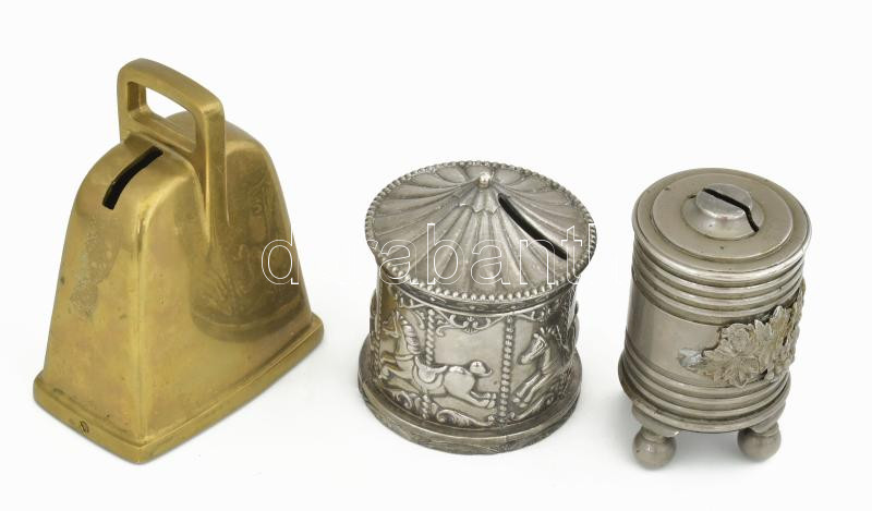 Leírás: 3 db régi persely: réz, fém, 12 cm-ig