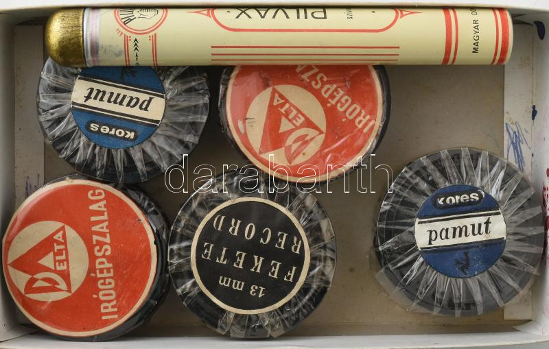 Leírás: 5 db írógépszalag, Kores, Delta, Fekte Record + ceruzagrafitok Pilvax Szivar fém dobozban