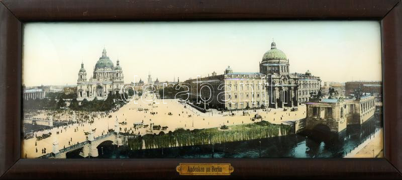 Leírás: Andenken an Berlin, régbbi szuvenír kép, nyomat, gyöngyház berakással, Dekoratív fakeretben. 12x32 cm