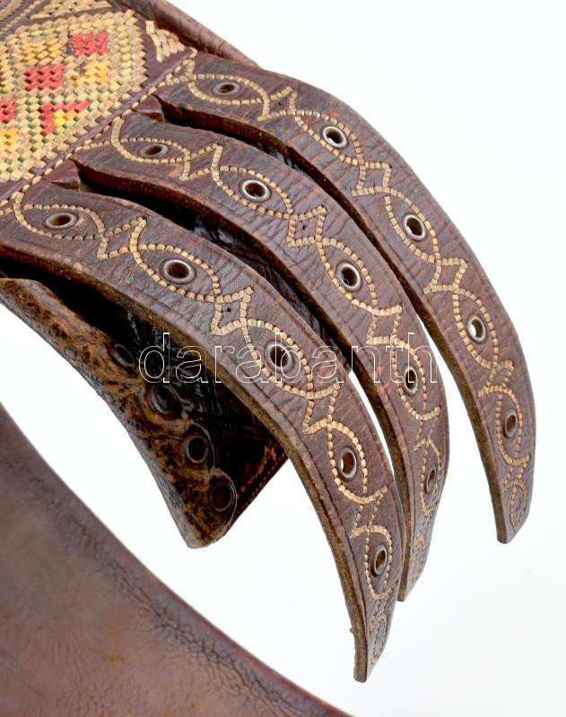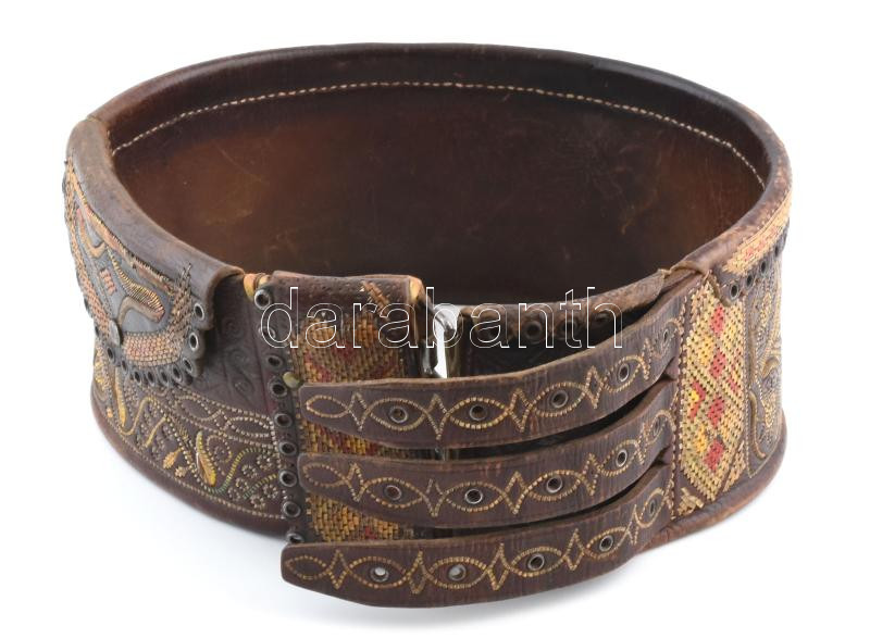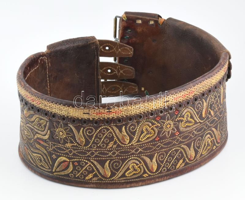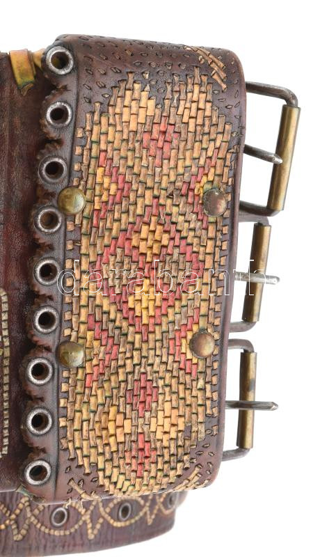 Leírás: Gyimesi csángó bőröv, gazdagon díszített, szép állapotban, sz: 14 cm, d: 30 cm